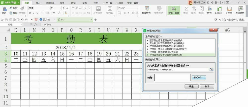 2、选择使用公式确定要设置单元格的格式,输入公式:=MONTH(AD3)>MONTH(AC3),点击格式;