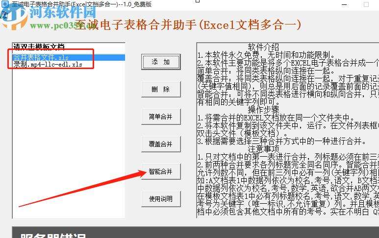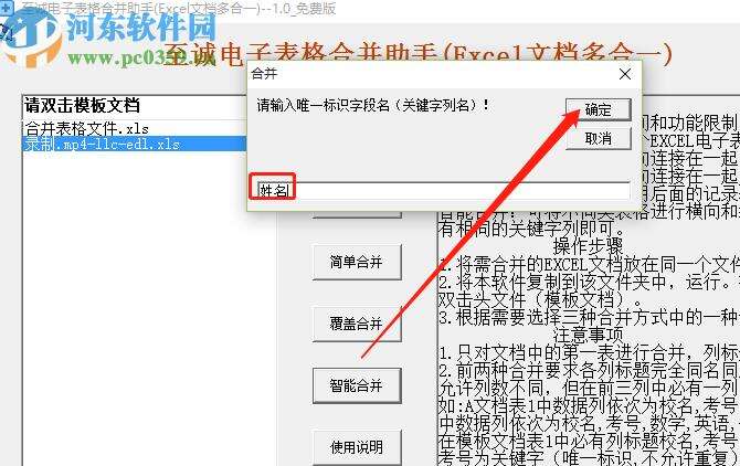 4.点击智能合并之后接下来需要在出现的界面中输入想要合并Excel文件的关键字列名,输入成功之后点击确定按钮。
