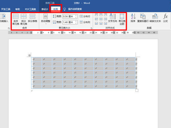 4、点击【布局】即可调整单元格大小,是否合并以及文字对齐方式。