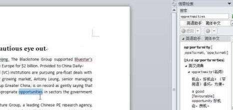 3、若想深入了解和学习此单词,单击浮动窗口上的第一个“文本翻译”按钮,将在word窗口右侧出现翻译窗口栏,显示单词的详细解释。