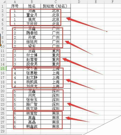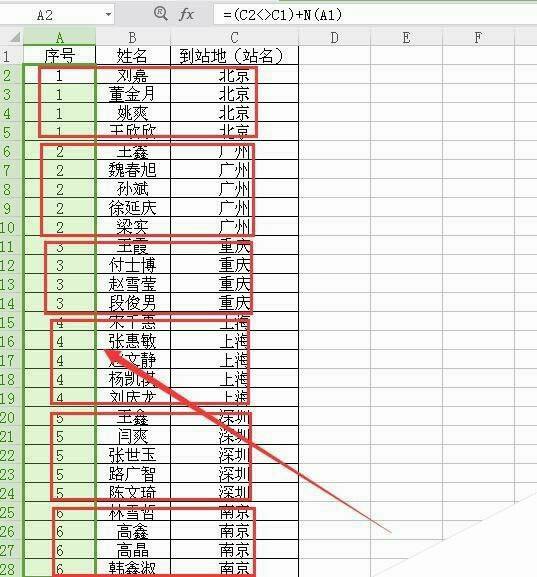 7、此时可以看到公式已经自动为c列相同的单元格添加了相同的序号了。