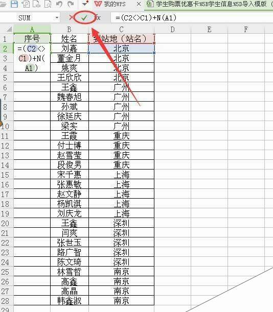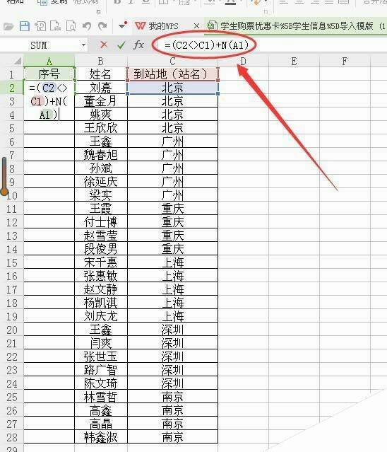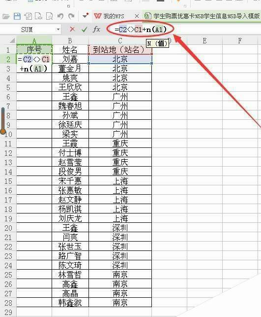 4、将公示修改为=(C2<>C1)+N(A1),在C2<>C1两边加了一对括号的作用是保证先进行逻辑运算,C2<>C1的作用是执行逻辑判断,返回值为1或者0。