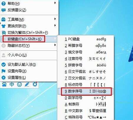 还有一种插入罗马数字的方法,就是利用输入法来实现。在此以“百度输入法“为便,右击百度输入法状态栏,从其扩展菜单中选择"软键盘”->“数字序号”项。