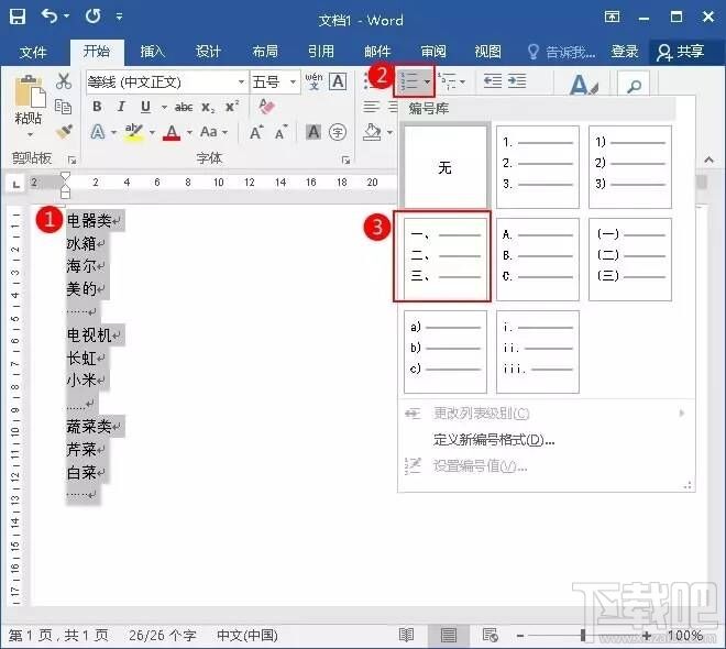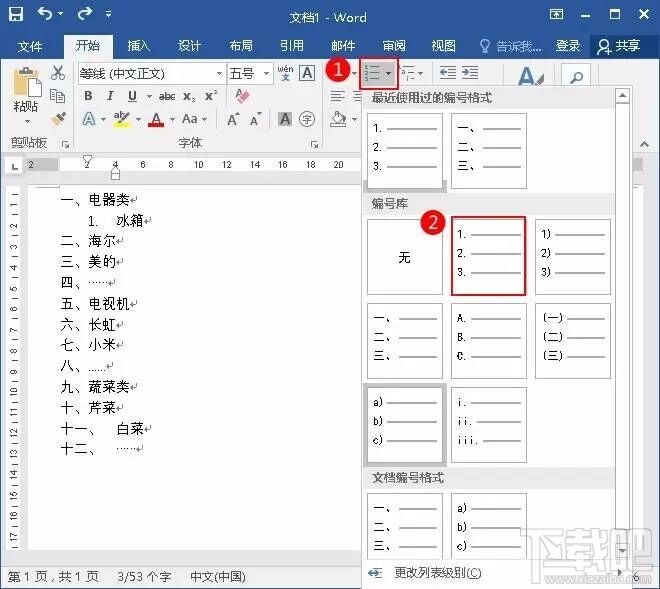 3、单击“段落”选项组的“编号”,选中格式为“1、2、3、”的编号。