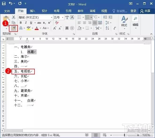 6、然后双击格式刷,在“二”和“三”前面单击,然后按Esc键退出格式刷。