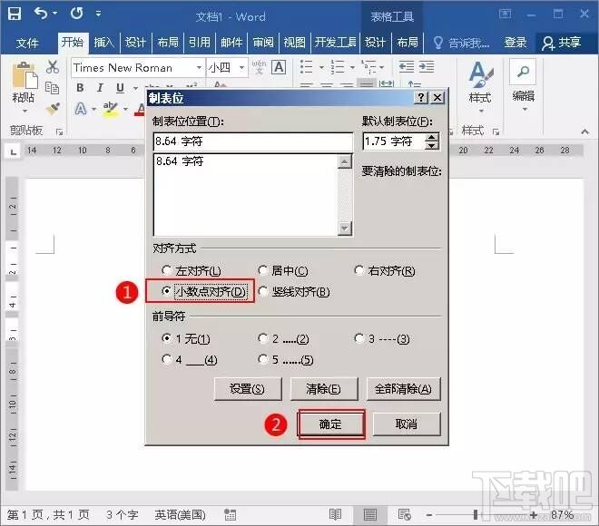 2、在制表位对话框中,将对齐方式设置为“小数点对齐”,然后点击“确定”按钮。