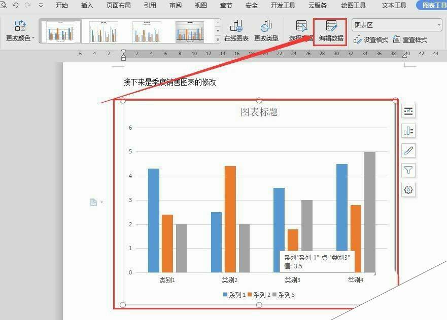 3、选中图表,在菜单栏中,点击“编辑数据”(如下图)