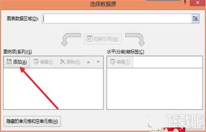 4、在【选择数据源】的对话框中,点击【添加】,选择需要添加的XY轴的数据值