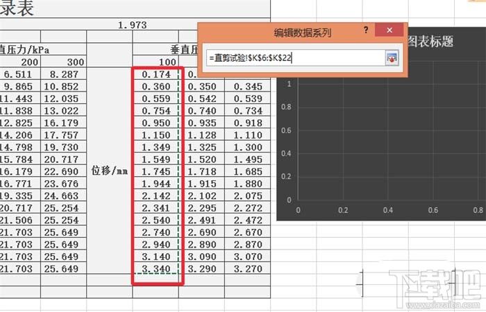 6、对话框变为小矩形框,然后我们就可以选择我们的数据源,选中数据之后我们点击小矩形框右侧的小方框,X轴的数据选择完毕,Y轴的选择同X轴一样,不再赘述。在选择完毕之后,点击【确定】,回到【编辑系列数据源】对话框中