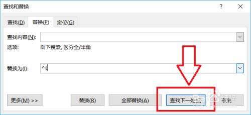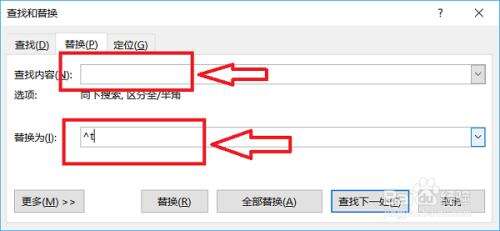3、弹出的“替换”功能窗口中,将需要被替换的符号(查找内容)设置成空格,这里直接在输入框中敲空格键。替换内容设置为制表符,在“替换为”的输入框中键入“^t”。