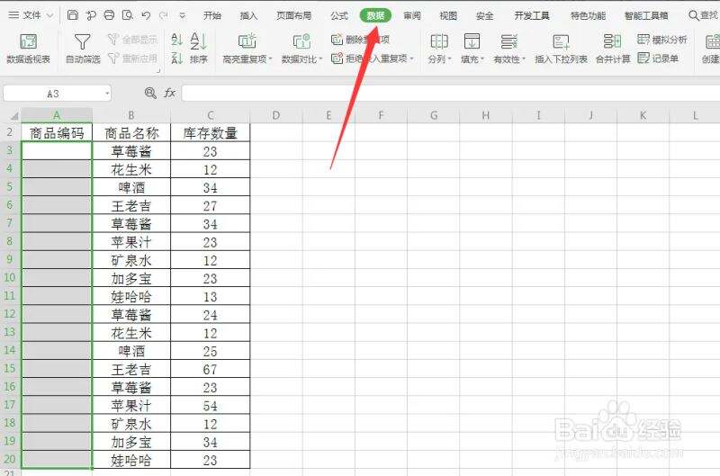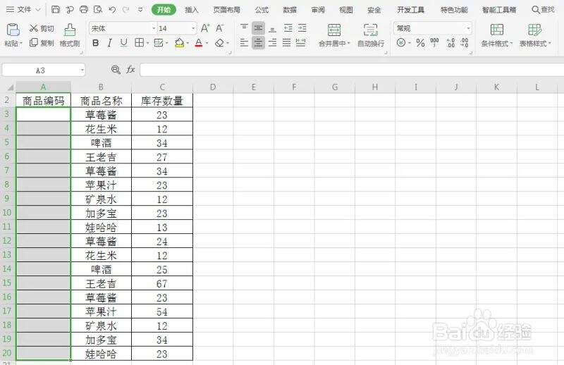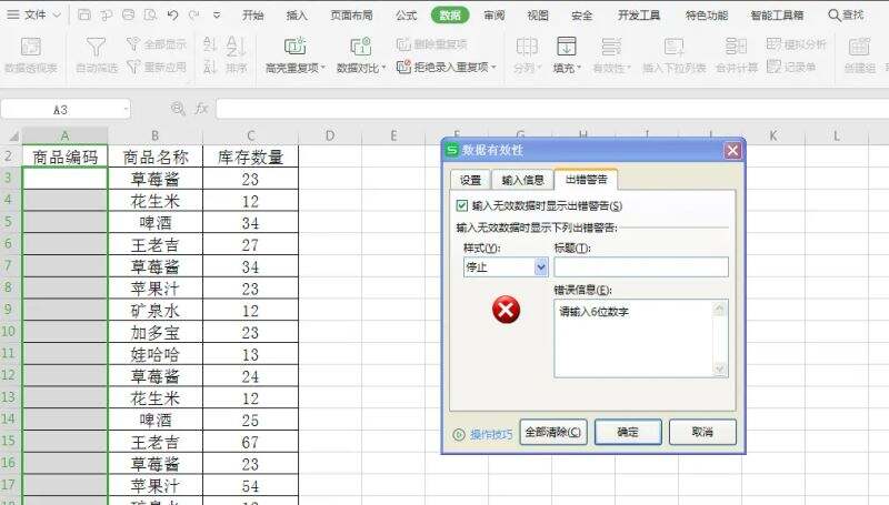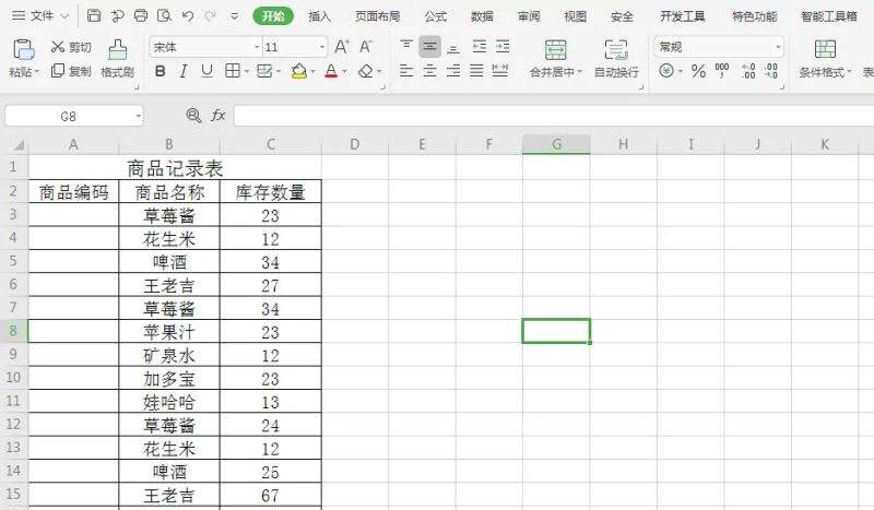 打开一个“商品记录表”,含有“商品编码”、“商品名称”及“库存数量”,我们现在需要设置录入的商品编码为6位数据。