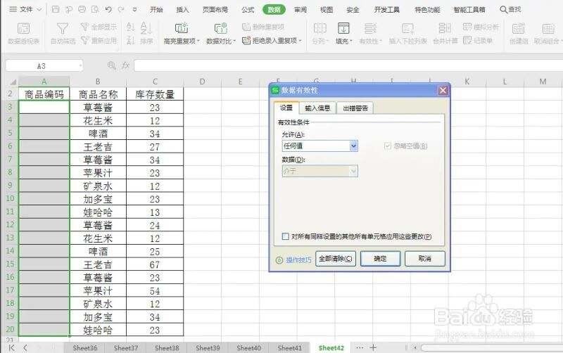 选择工具栏上的数据——有效性,然后单击有效性下拉列表选择“有效性”。