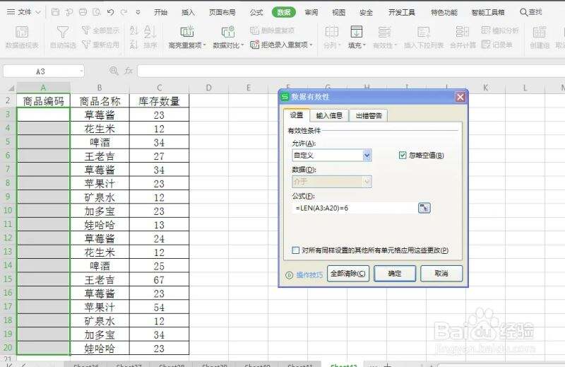 在出现的数据有效性对话框设置项下,允许下拉列表中选择“自定义”,然后在公式文本框中输入“=LEN(A3:A20)=6”.