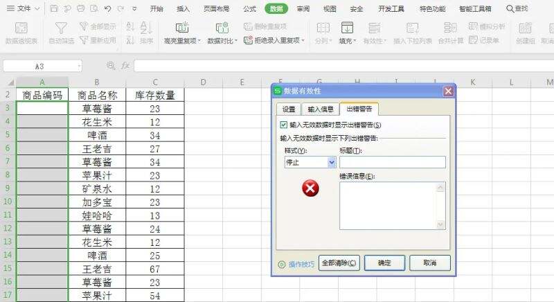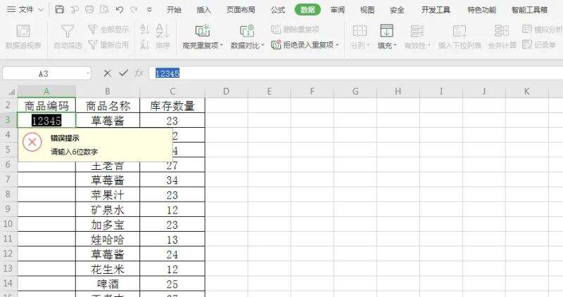当我们在“商品编码”列下录入5位数字时,表格中就会出现错误提示。如图所示