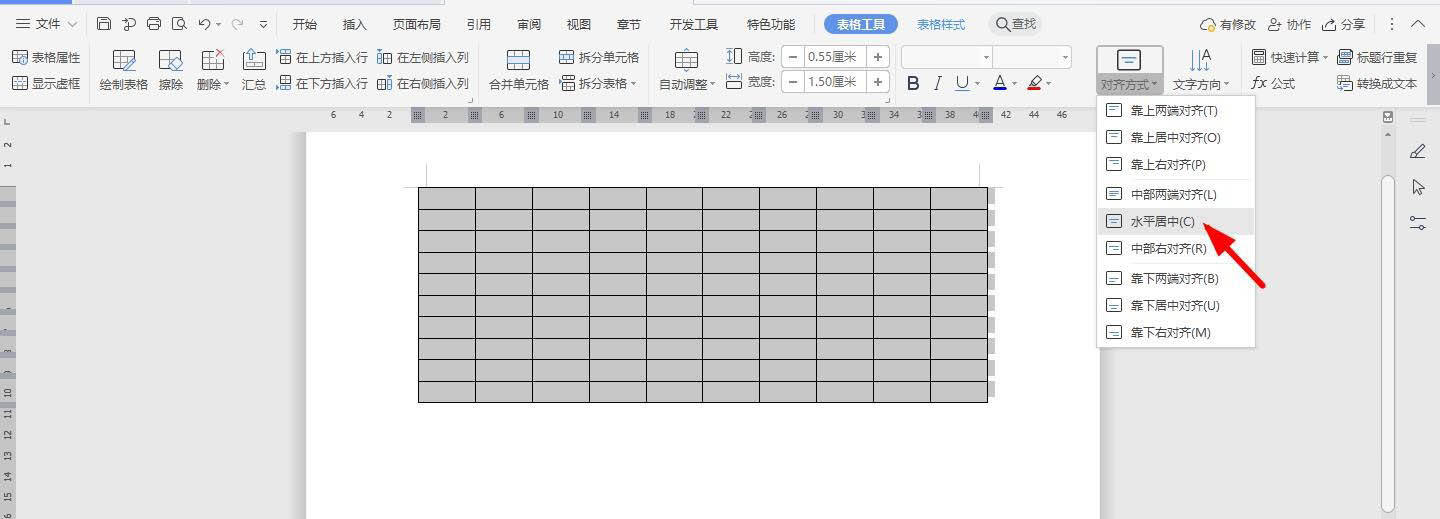 3、选中表格,点击“表格工具-对齐方式”中的“水平居中”