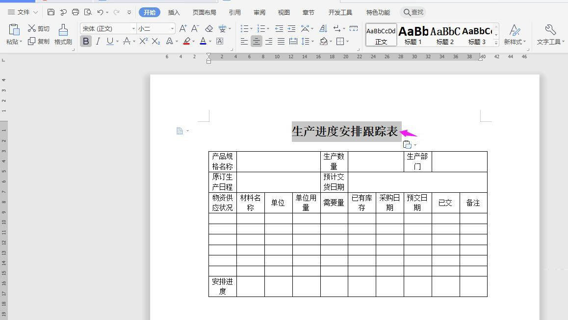 8、然后在表格上面输入“生产进度安排跟踪表”加粗、加大、居中,这样表格就制作完成了