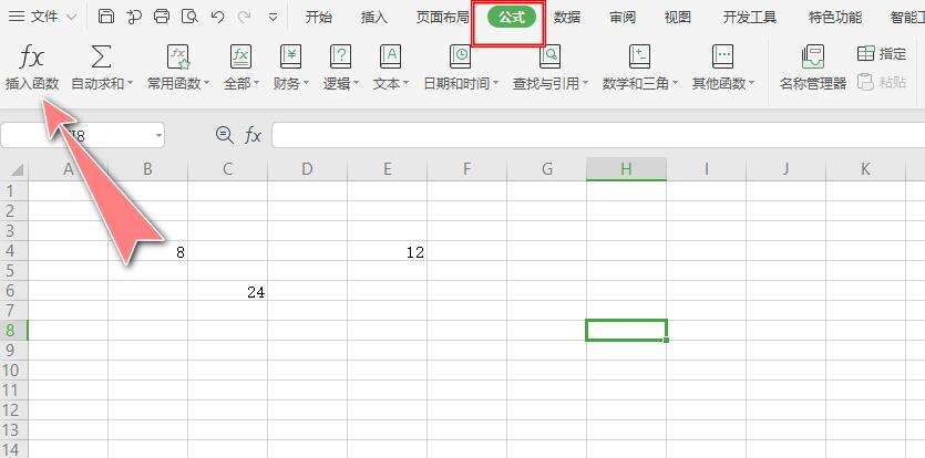 3、选中其它一个单元格,点击"公式"->"插入函数"。