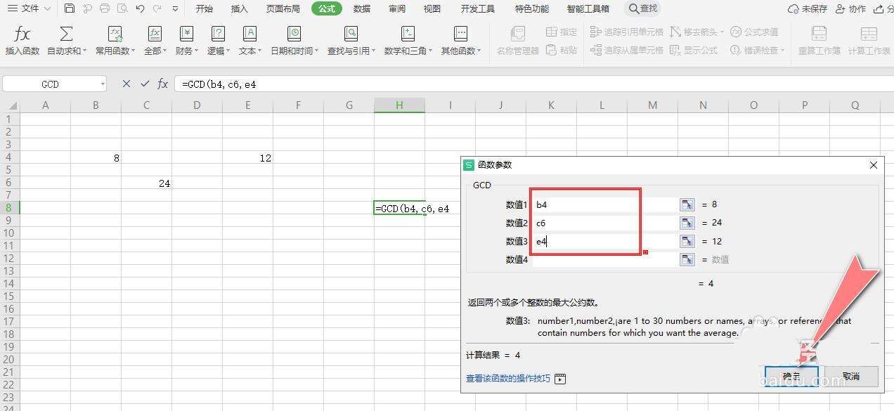 6、完成配置操作后,即可计算多个单元格中的最大公约数。