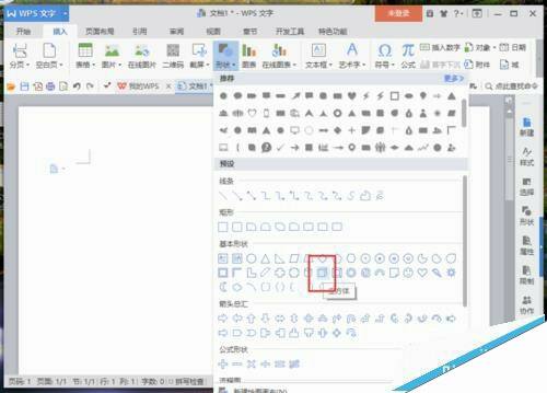 2、在wps文字编辑区域,打开“插入”菜单选项卡,并点击“形状”选项按钮。如图所示;