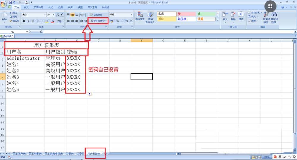 3、按照上述步骤继续制员工销售业绩表(主要列的内容为编号、姓名、销量金额)——工资表主要列的内容为编号、姓名、基本工资、考勤、奖金、总计——工资条表(主要合并A1:F1,然后输入工资条,其它不用输入)