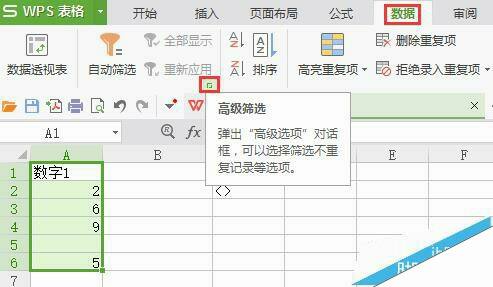 2、选择筛选区域。点击“数据”->“高级筛选”,如下图