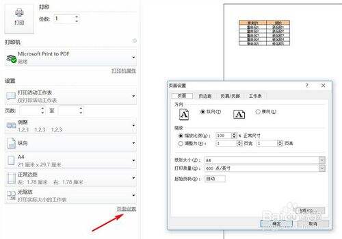 2、进入打印设置页面后,在页面找到页面设置,单击会出现页面设置配置框