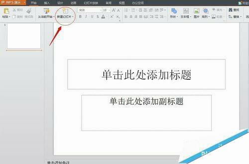 3、新建一个PPT文件后,可以看到一个基本的幻灯片界面。如果需要增加新的幻灯片,可以看到红色箭头指向的新建幻灯片,点击这里即可增加幻灯片的页数。