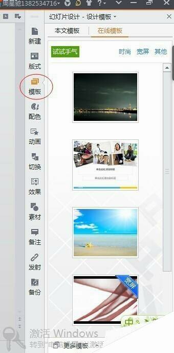 4、WPS演示文件有许多在线模板可供下载使用,在右侧可以选择自己喜欢的模板下载下来使用,在这里还可以看到配色、动画、切换、效果等选项来选择,来更好的设置自己的幻灯片。