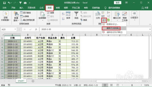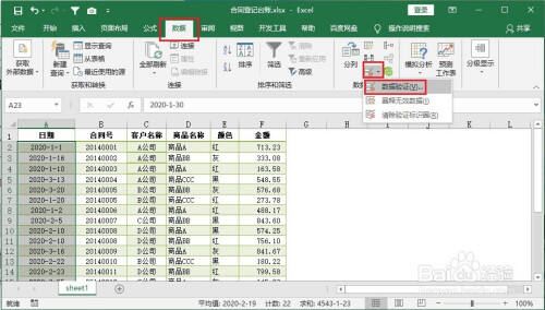 5、最后点击【数据】选项卡下【数据工具】命令组中【数据验证】下拉菜单中的【圈释无效数据】命令。