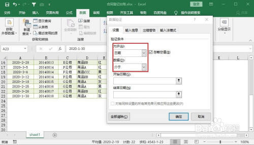 3、在【数据验证】对话框中,在【允许】处下拉菜单中选择【日期】,然后在【数据】下拉菜单中选择【介于】。