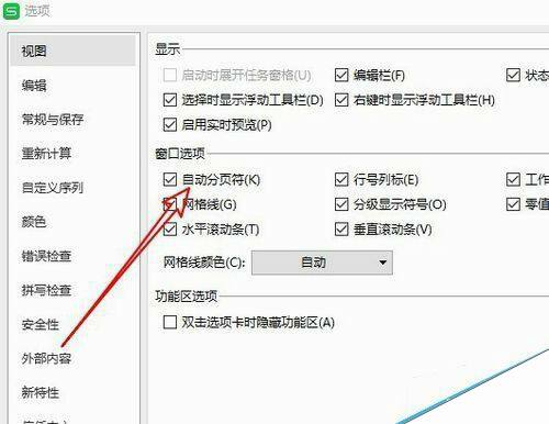 在右侧的窗口中,我们找到“自动分页符”的设置项,把其前面的勾选去掉。
