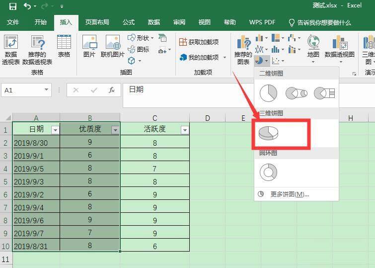 2、点击插入——饼图——三维饼图,选择合适的图表样式
