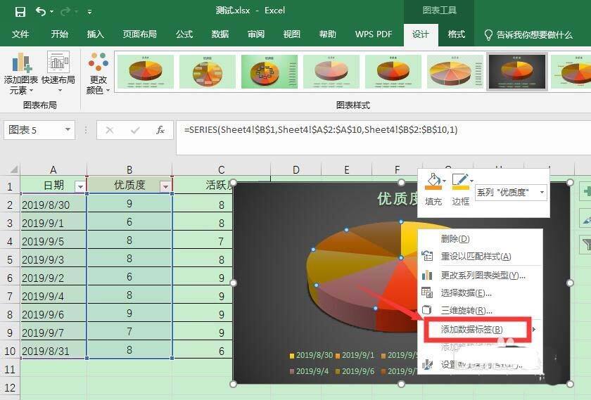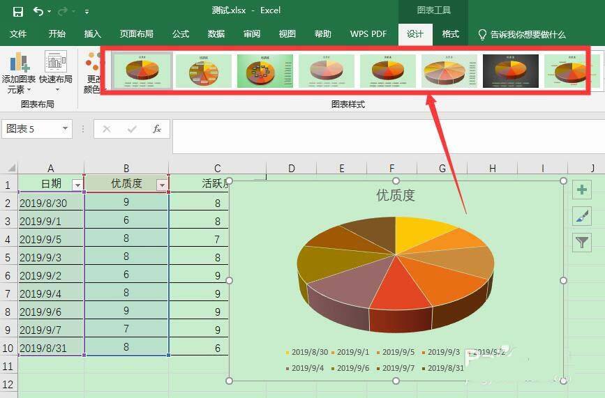 6、就能看到插入了立体饼图,设计中,可以选择图表样式