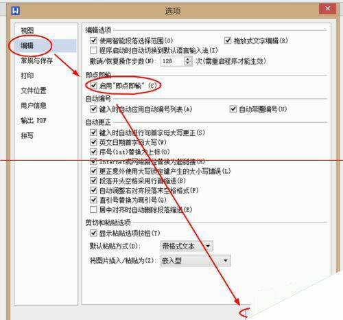 3、在【选项】界面下,点击选择【编辑】–勾选【启用“即点即输”】–【确定】选项完成设置。(如图所示)