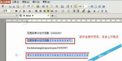 1、在文档中选中需要转换的全角字符,然后点击上方菜单“格式”。