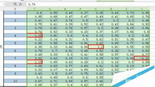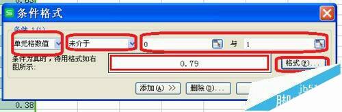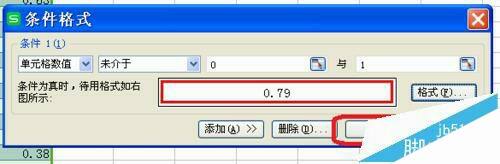 5、返回到条件格式设置,继续点击确定(如果需要可点击“添加”增加其他条件格式)就会处理数据了, 结果如图所示,所有未介于0~1的数字边框变红。