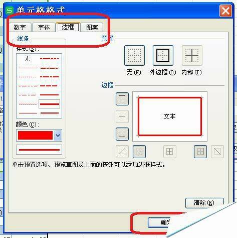 4、进入单元格格式设置,可以对数字,字体,边框,图案填充等选项根据实际需要做出调整,(这里将边框设置为红色线条),点击确定。
