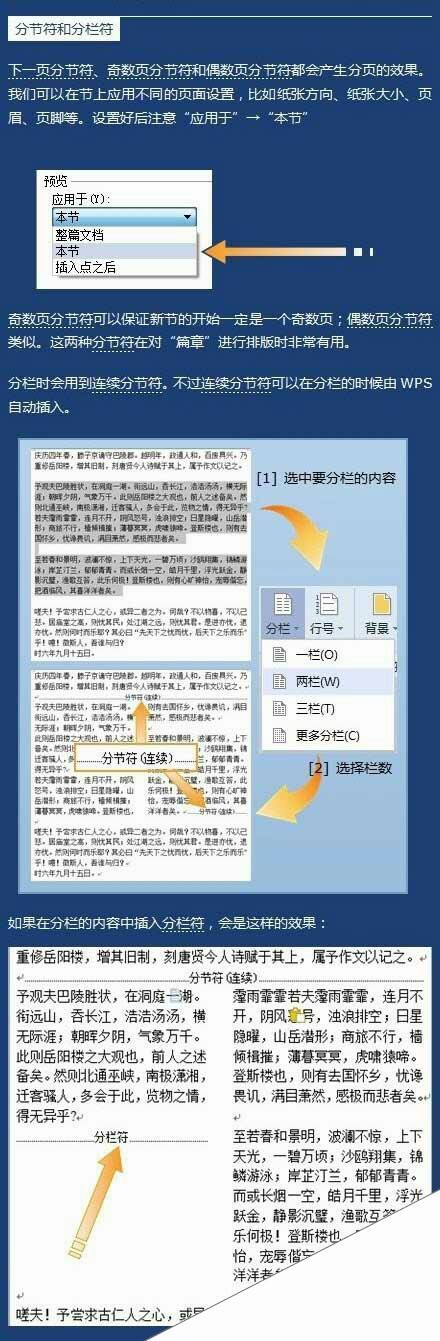 要在版面的不同阶段设置不同的样式,就常会用到“分节”。为了便于阅读,我们还常常会根据版面宽度进行“分栏”。需要注意的是,分栏往往不是孤立产生的,它往往同时伴随着分节符的产生。