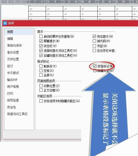 大家经常为文档中表格里的段落符号而感到视觉上的不爽吧?如何才能关闭它呢?其实只需通过WPS的选项窗口,将“视图”设定下面的“段落标记”选项的复选去掉即可。Word选项则为“显示”设定下的“段落标记”。