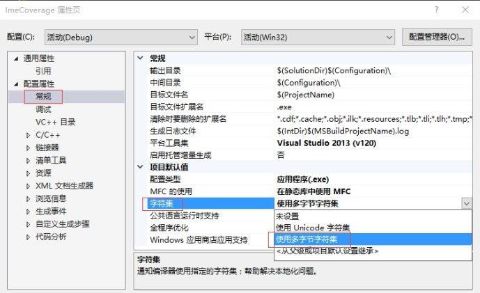字符集可以通过项目属性修改:项目属性→配置属性→常规→字符集。我的字符集(VS2013编码环境)为: