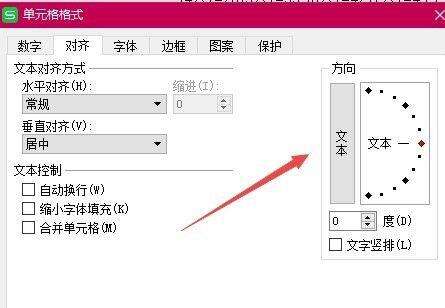 6、在打开的对齐窗口中,点击右侧“方向”设置框中的“文本”这个按钮,也可以实现同样的效果。