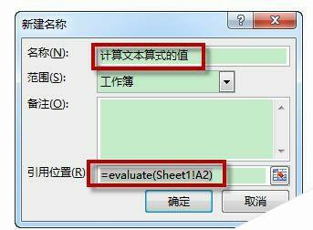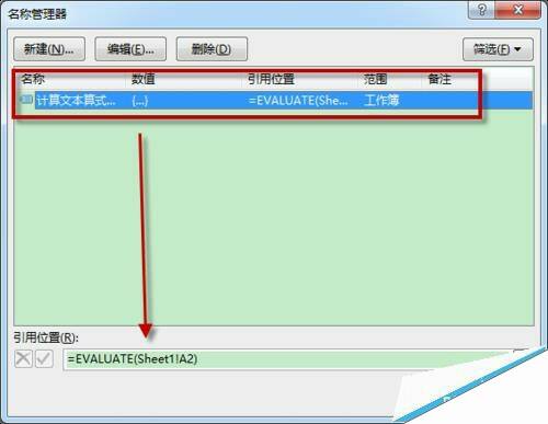 3、将名称文本框中的原有名称删除,输入新的名称“计算文本算式的值”;将引用位置中的“=Sheet1!$B$2”改为“=evaluate(Sheet1!A2)”,然后单击“确定”命令,将在”名称管理器“对话框中看到刚刚新建的名称。