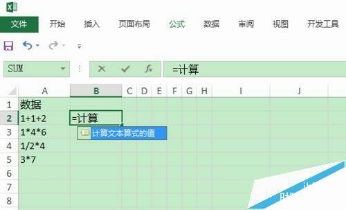 4、通过以上的步骤新建了名称后,在B2单元格输入“=计算”将会自动列出“计算文本算式的值”,也就是通过刚才的定义名称,就类似于自定义了一个函数。如下图所示