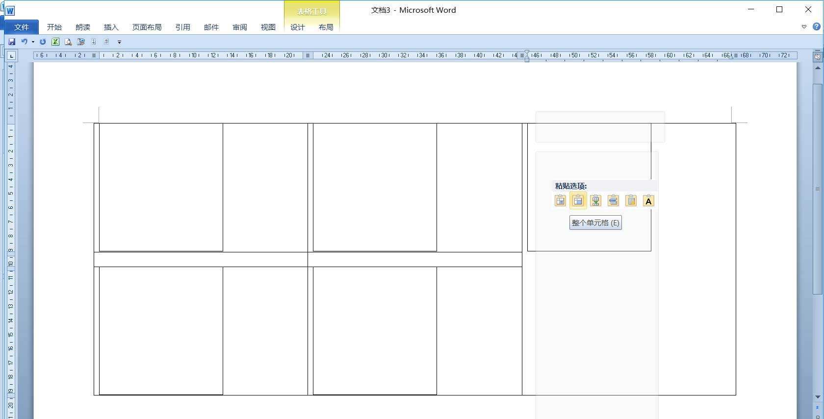 2、再插入一个如图的“3*3表格”,把第三列合并单元格。光标分别插入第一行、第三行及后面的五个单元格,右击鼠标进行“粘贴”,在“粘贴选项”中选择“整个单元格”。