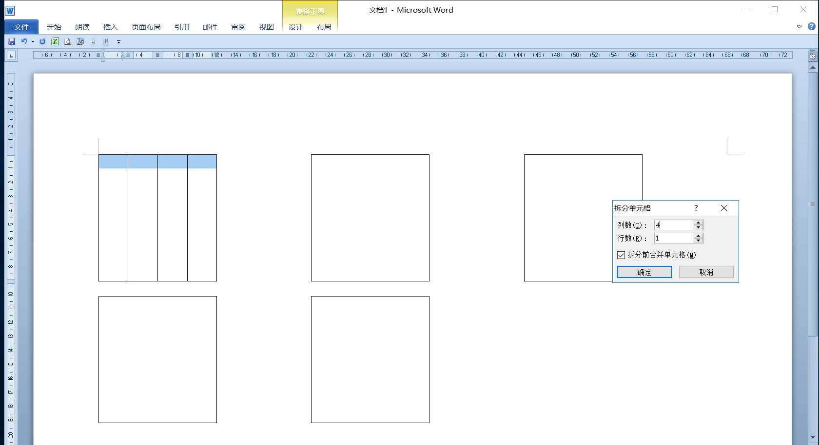 3、选中母表去掉框线,得到左右三组表格。选中第一组上面的表格,单击“表格工具”的“布局”选项卡,在“合并”组单击“拆分单元格”按钮,在打开的“拆分单元格”对话框中设置“列数:4”,“行数:1”。