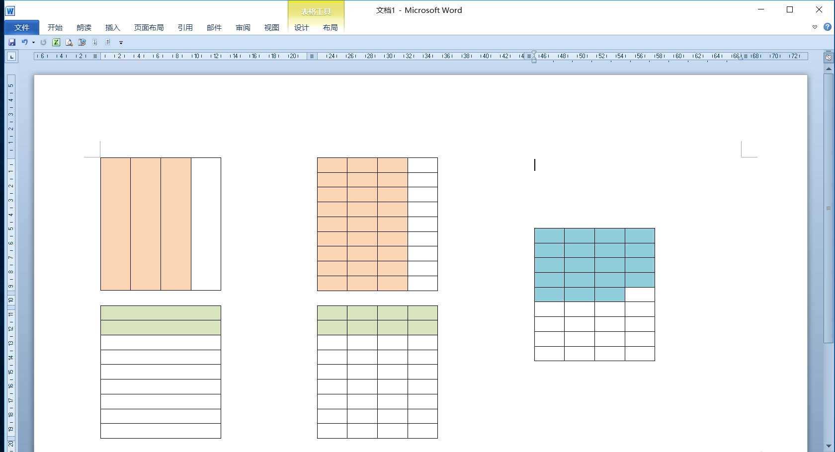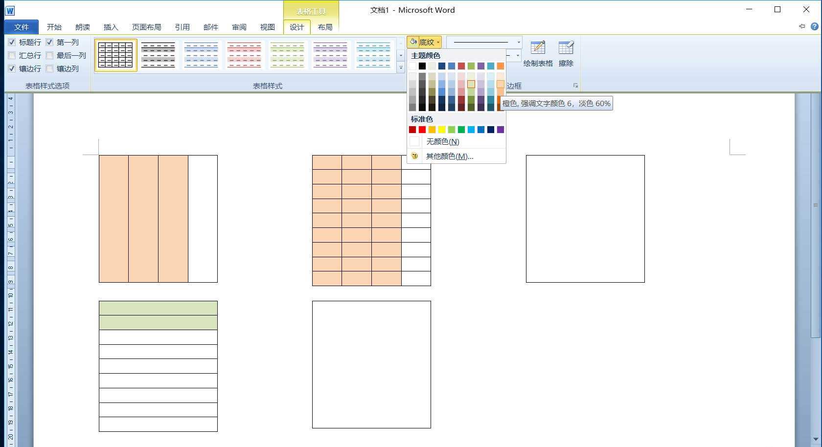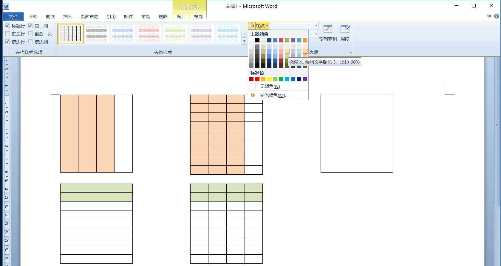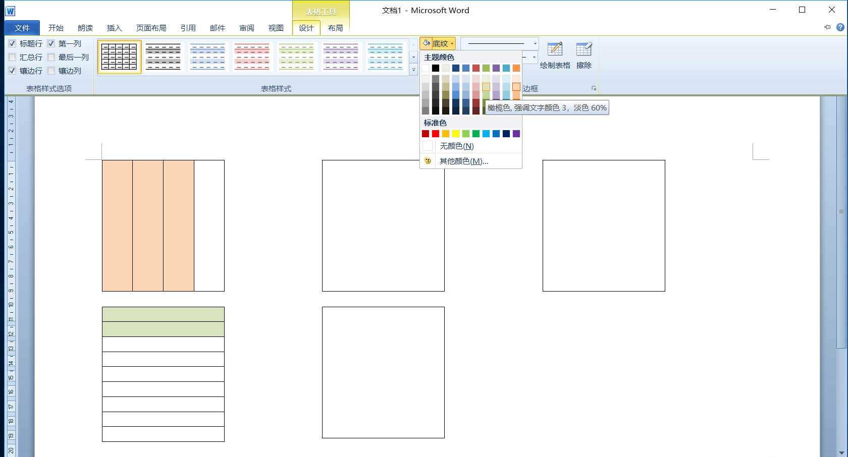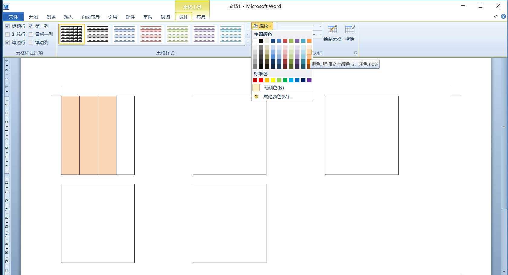 4、接着选中拆分的表格左侧3个单元格,单击“表格工具”的“设计”选项卡,在“表格样式”组单击“底纹”按钮,在下拉列表中选择一种填充色。