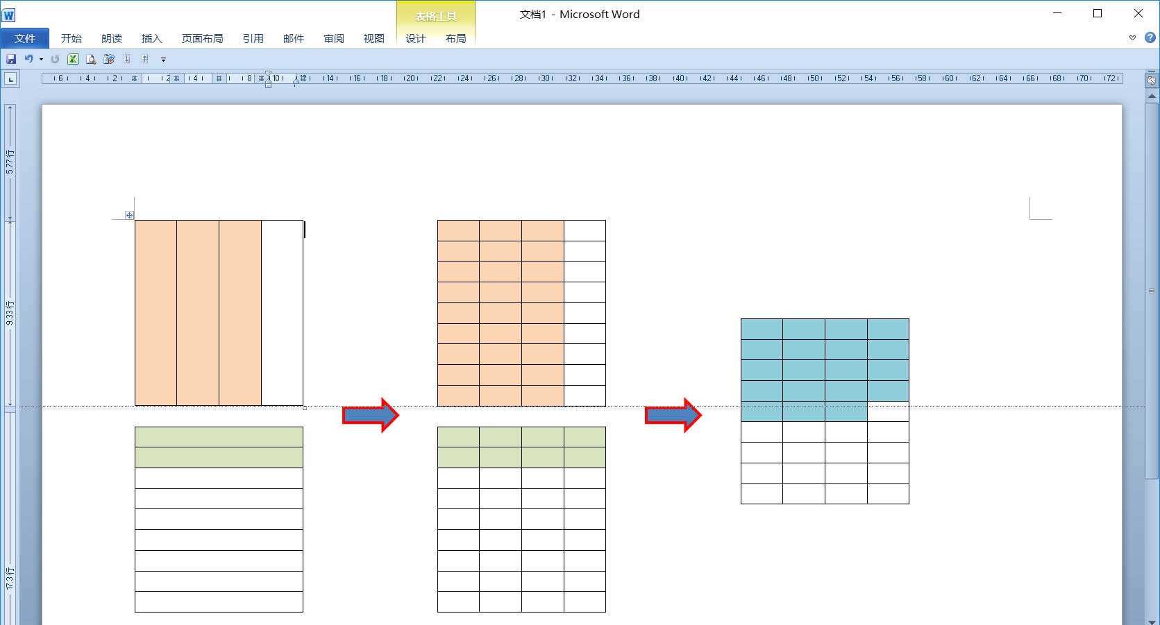 9、如果表格高度不一致,选中第一组表格的下框线,按着Alt键参考显示的虚线上下拖动和右面的表格对齐。最后从“形状”中插入两个向右箭头,把这三组表格联接起来。