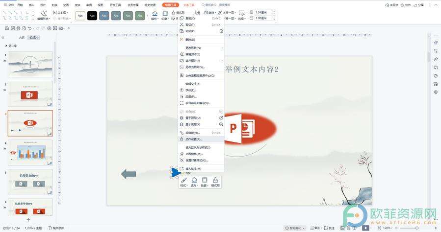 第一步:打开电脑版WPS演示文稿,点击选中想要添加动作的对象,比如我们这里点击选中三角形图形,鼠标右键点击一下,在弹出的选项中点击“动作设置”;