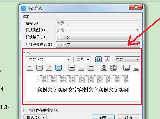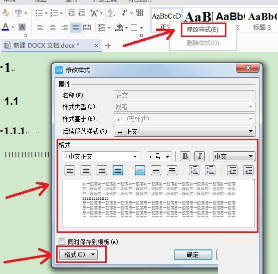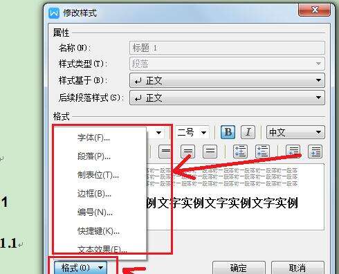 当您想要修改正文样式或标题样式时,只需右键正文、标题1、标题2等,在弹出的修改样式对话框中,通过格式栏和格式按钮进行相应设置。