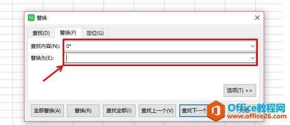 首先,我们按Ctrl+H键调出查找替换窗口,然后在查找内容处输入0*,*代表的是通配符,在这里表示要查找以0开头所有数据,替换后面为空,意思就是说查找以0开头的数据,全部替换为空。如图2